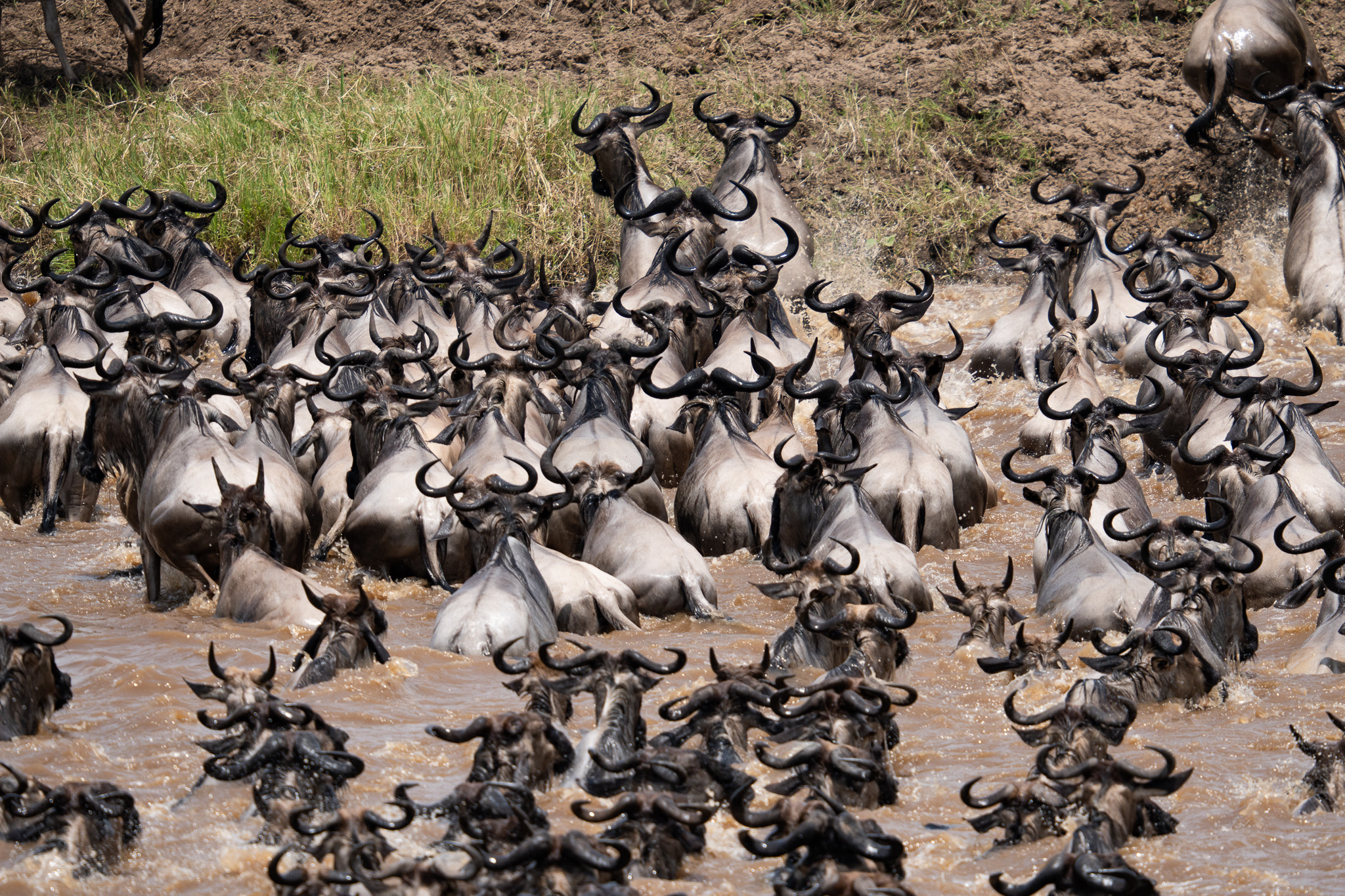 Mit etwas Glück erleben wir dann eines der spektakulärsten Naturschauspiele Afrikas: die Great Migration am Mara-Fluss. Tausende Gnus und Zebras sammeln sich am Ufer, zögern kurz und wagen dann den Sprung ins Wasser.